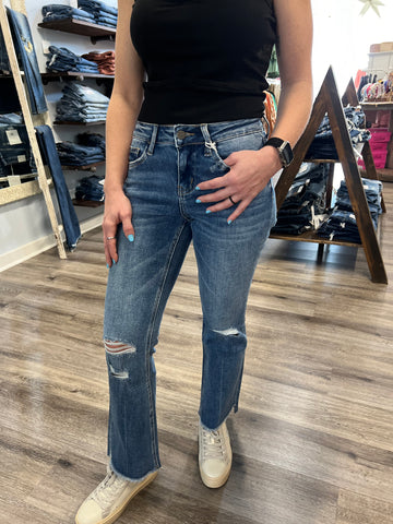 $62.99$0.00Available: In stockMid rise, medium to dark washed denim, uneven hemline, ankle flare 95% cotton 3% polyester 2% spandex