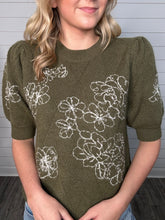 Solid short puff sleeve knit top featuring floral embroidery and textured diamond knit. Unlined. Knit. Non-sheer. Medium weight.