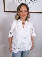 Embroidered lace short sleeve top featuring band collar split V-neck and scallop hem. Unlined. Woven. Semi-sheer. Lightweight.