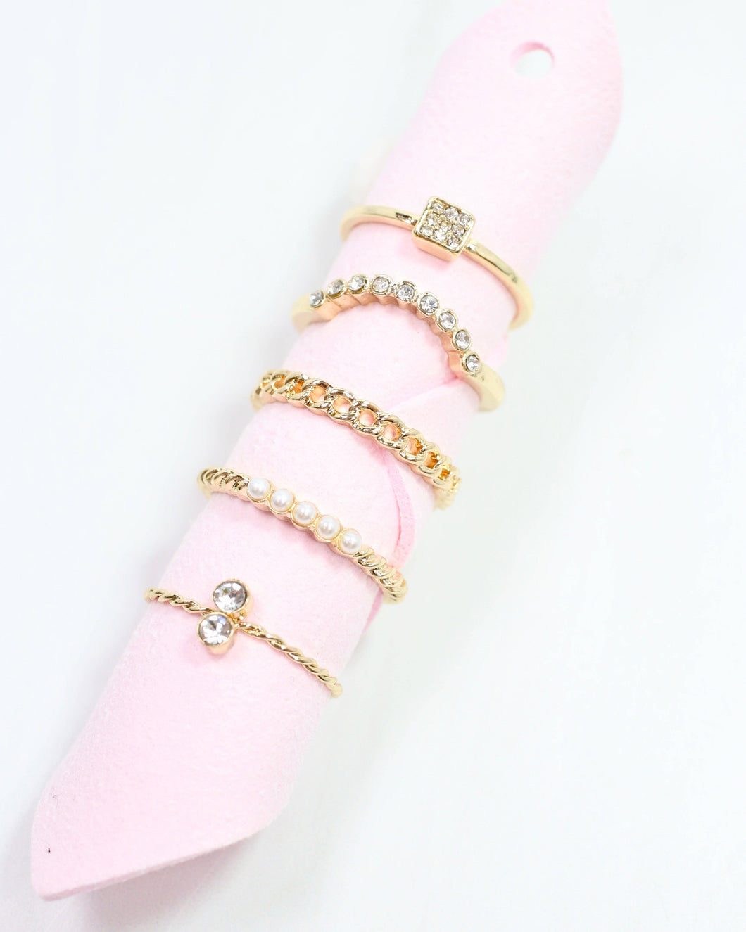 The Carter Ring Set Gold offers five fun rings with twisted, linked, and curved pavé designs. Wear them stacked or solo to match your playful style.