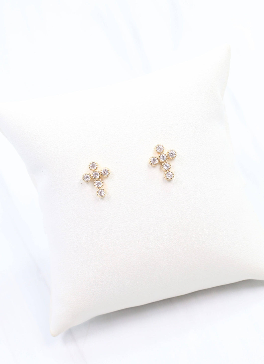 This simple cross stud earring is lined with round CZs for a subtle sparkly look on a post back. Dimensions: * 0.5" * Brass