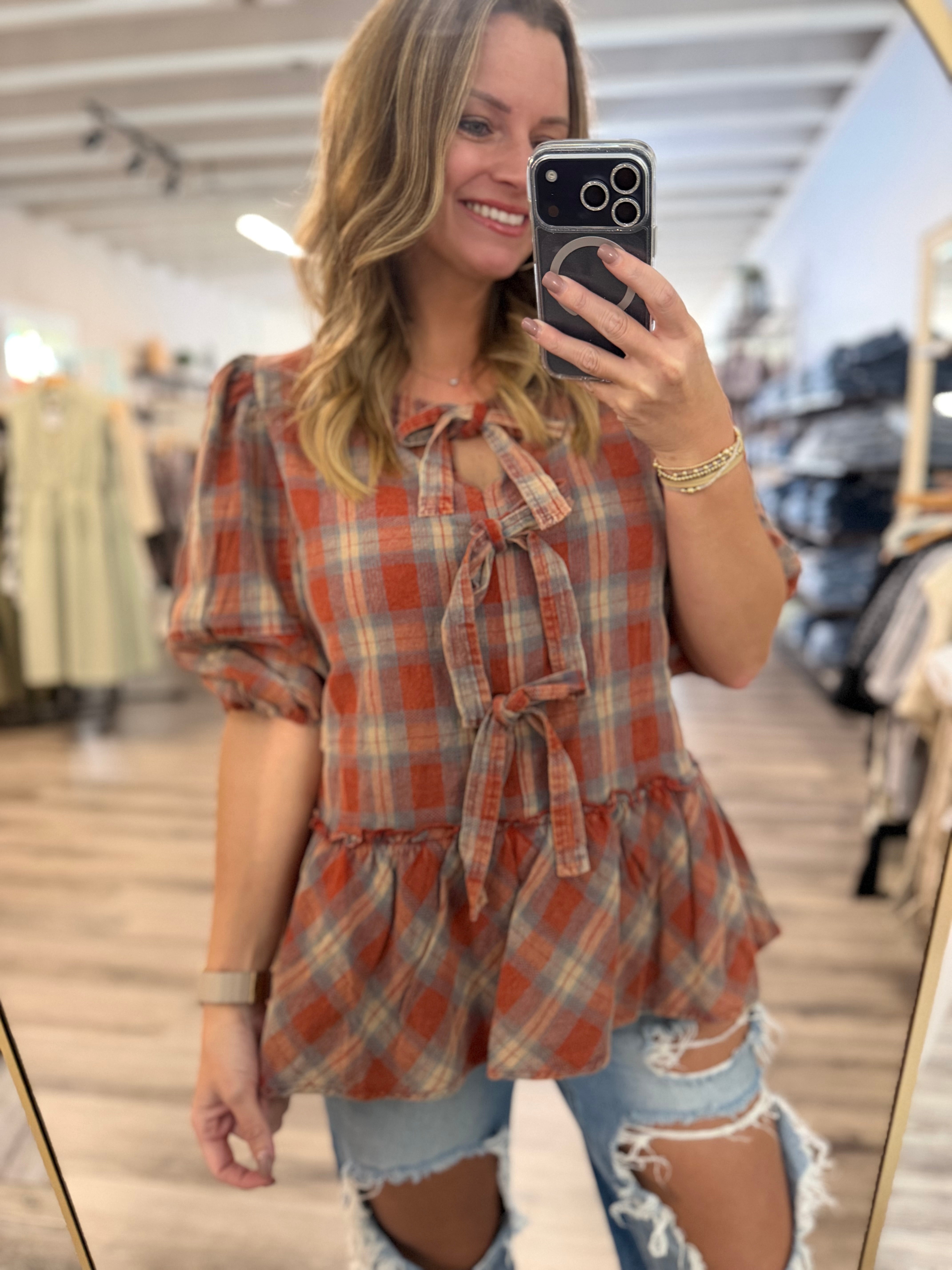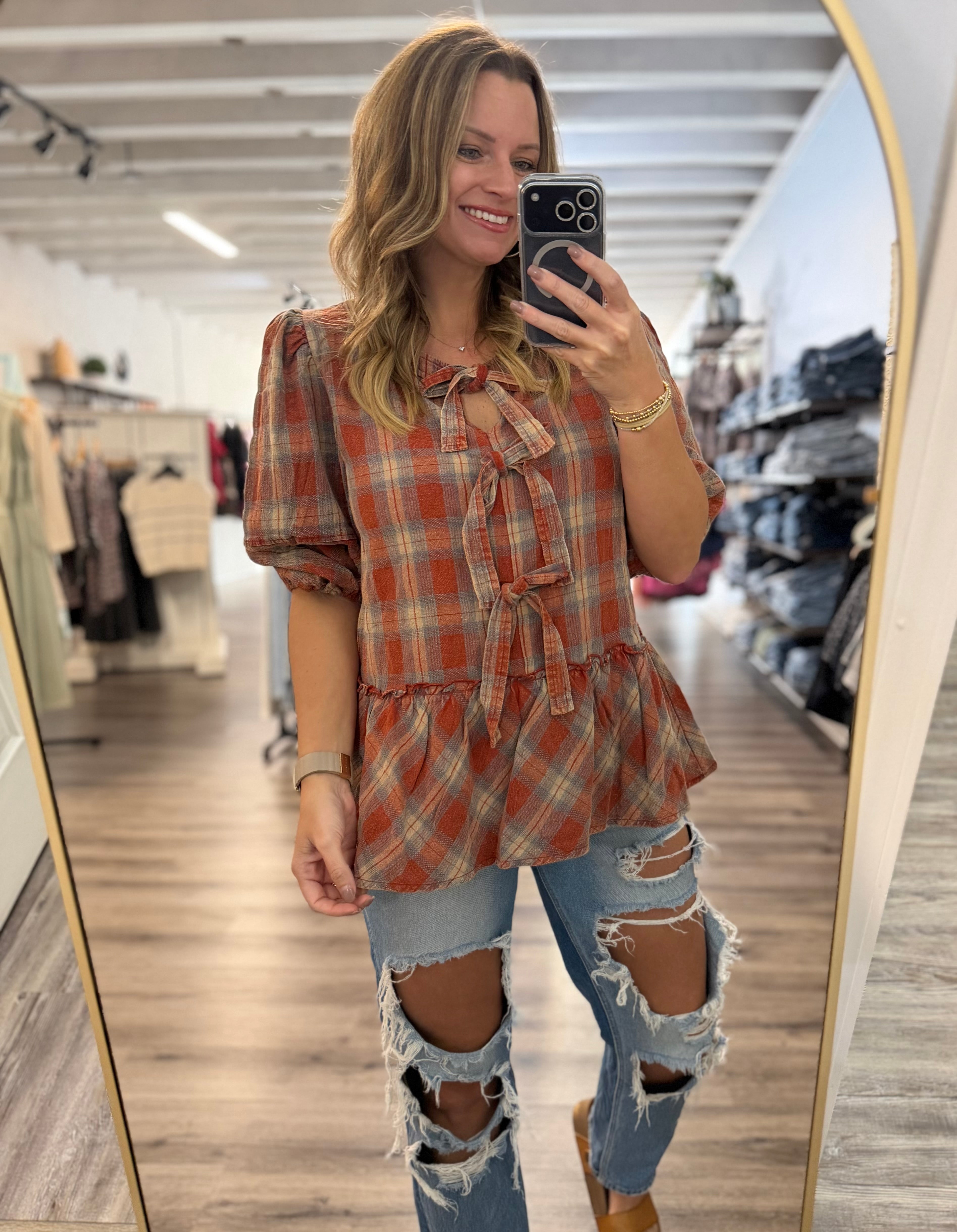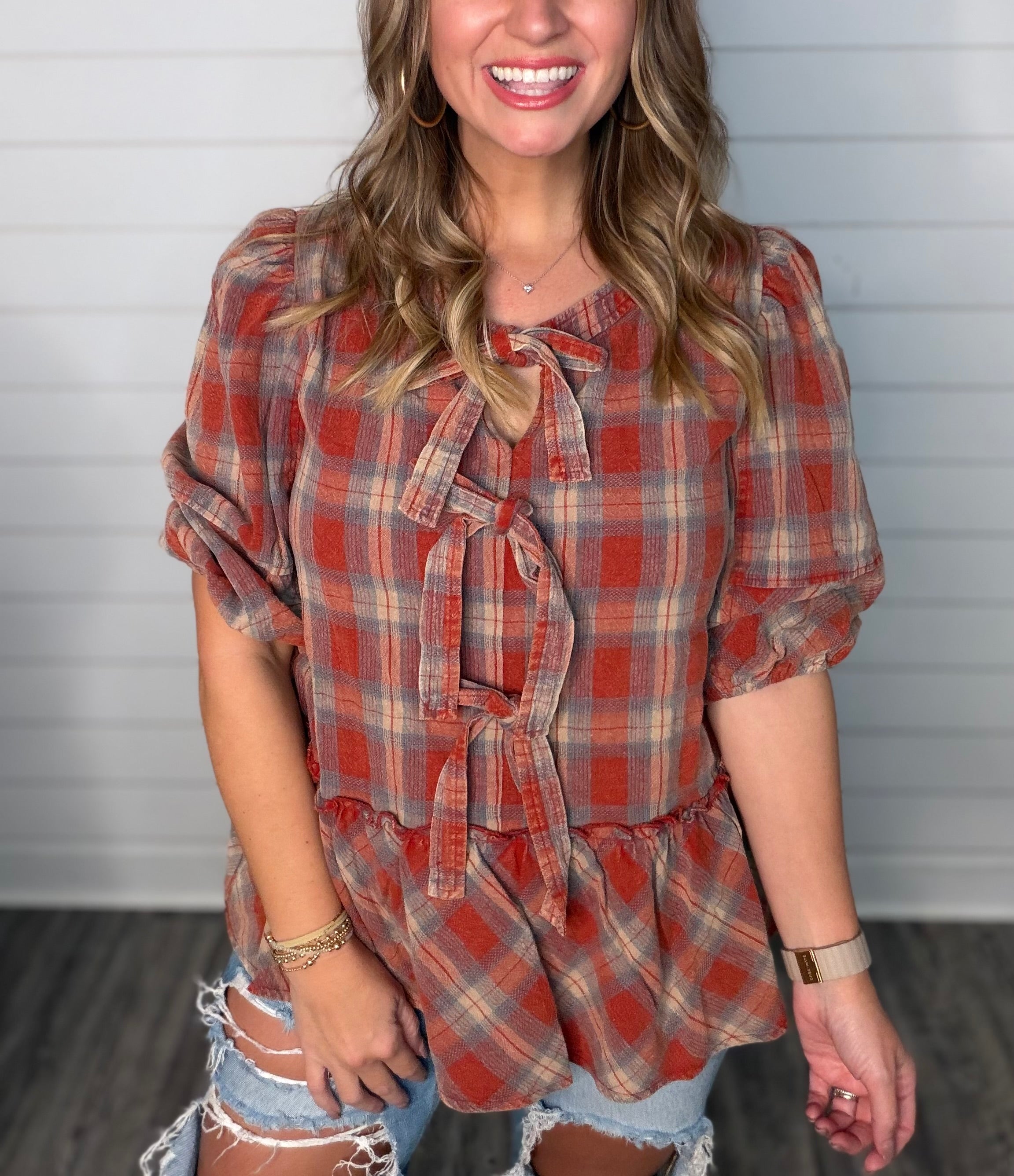$55.99$0.00Available: In stockVintage Rust Plaid Top with Bow Detail Model is wearing a size small