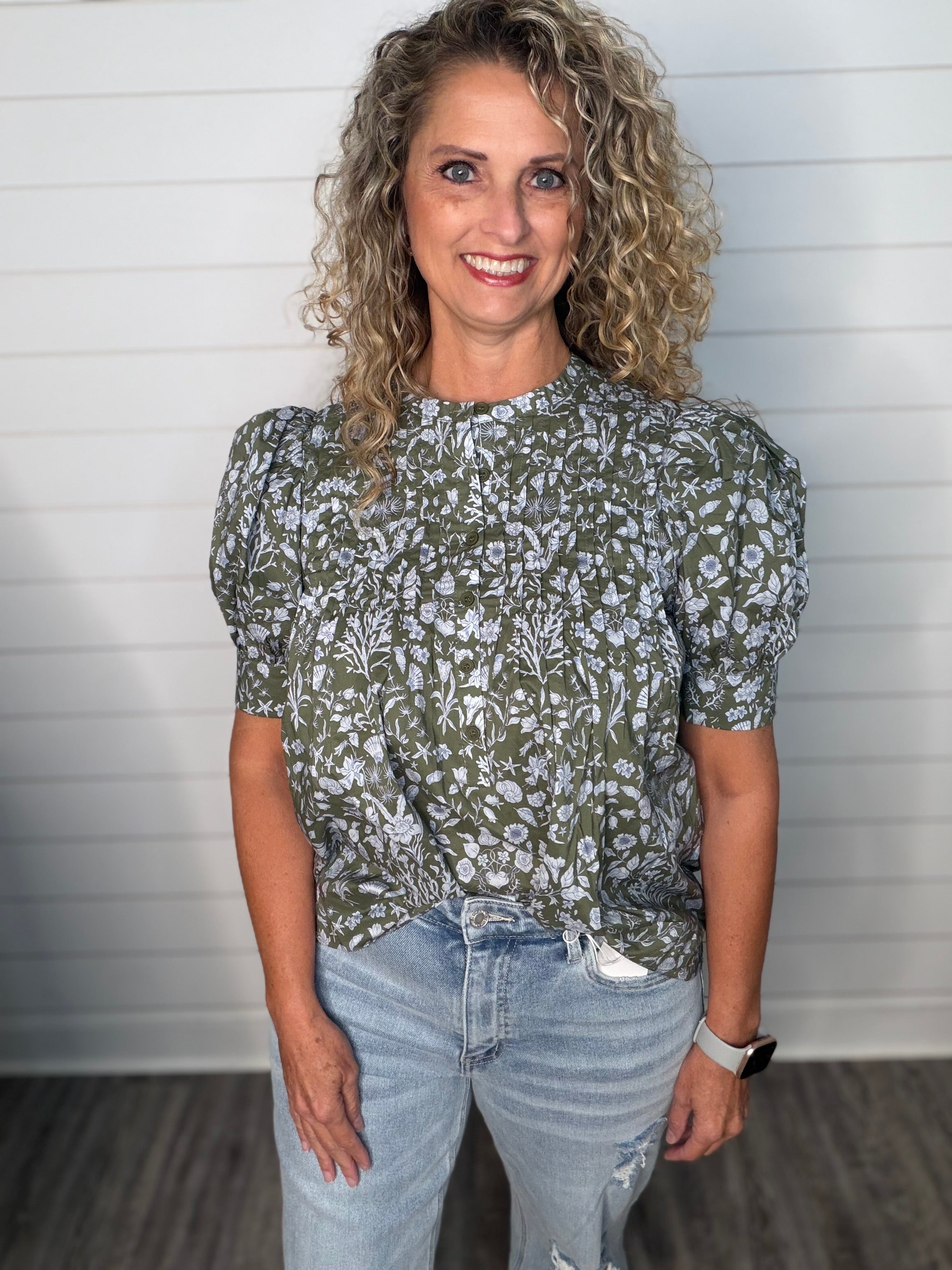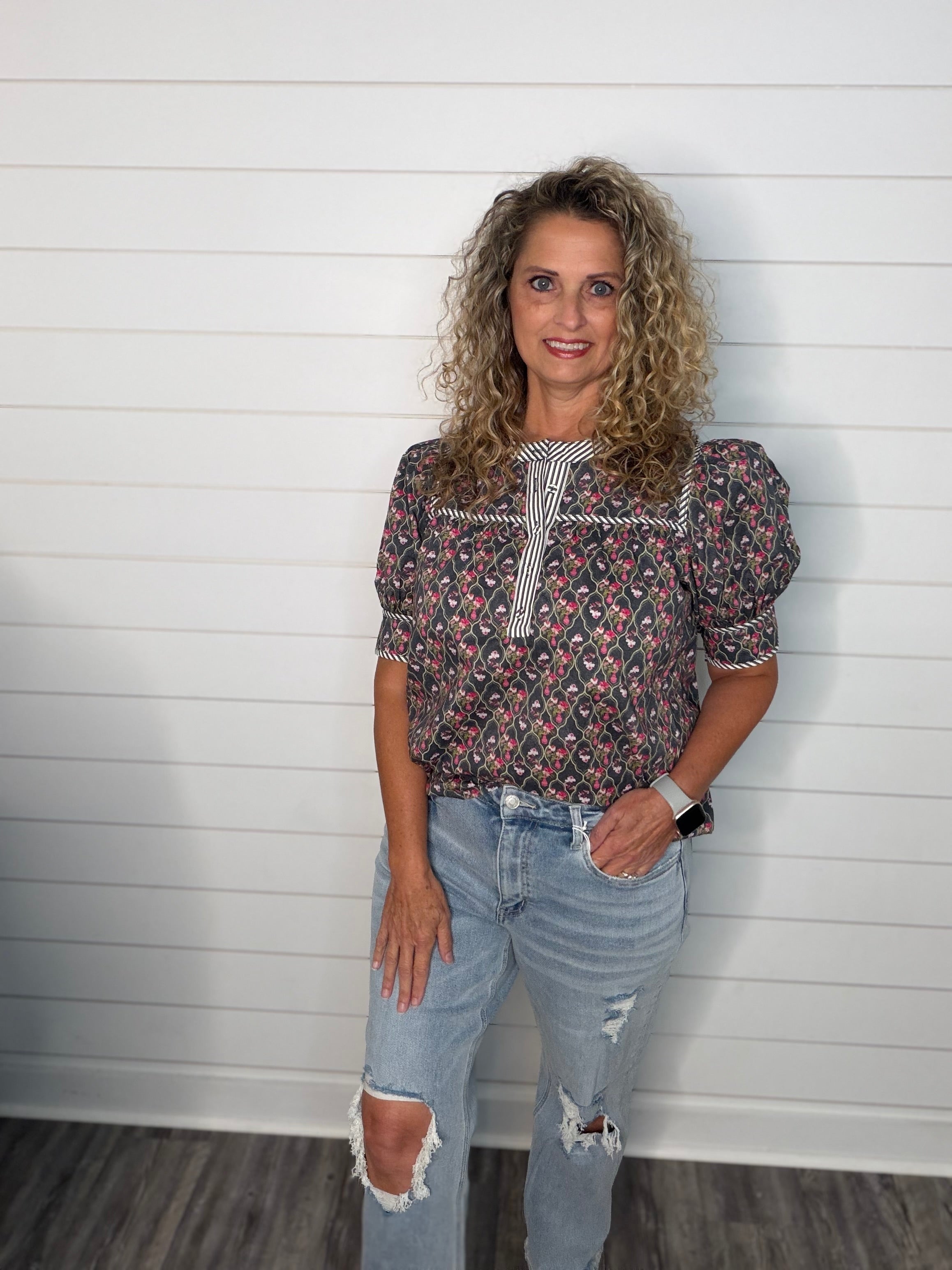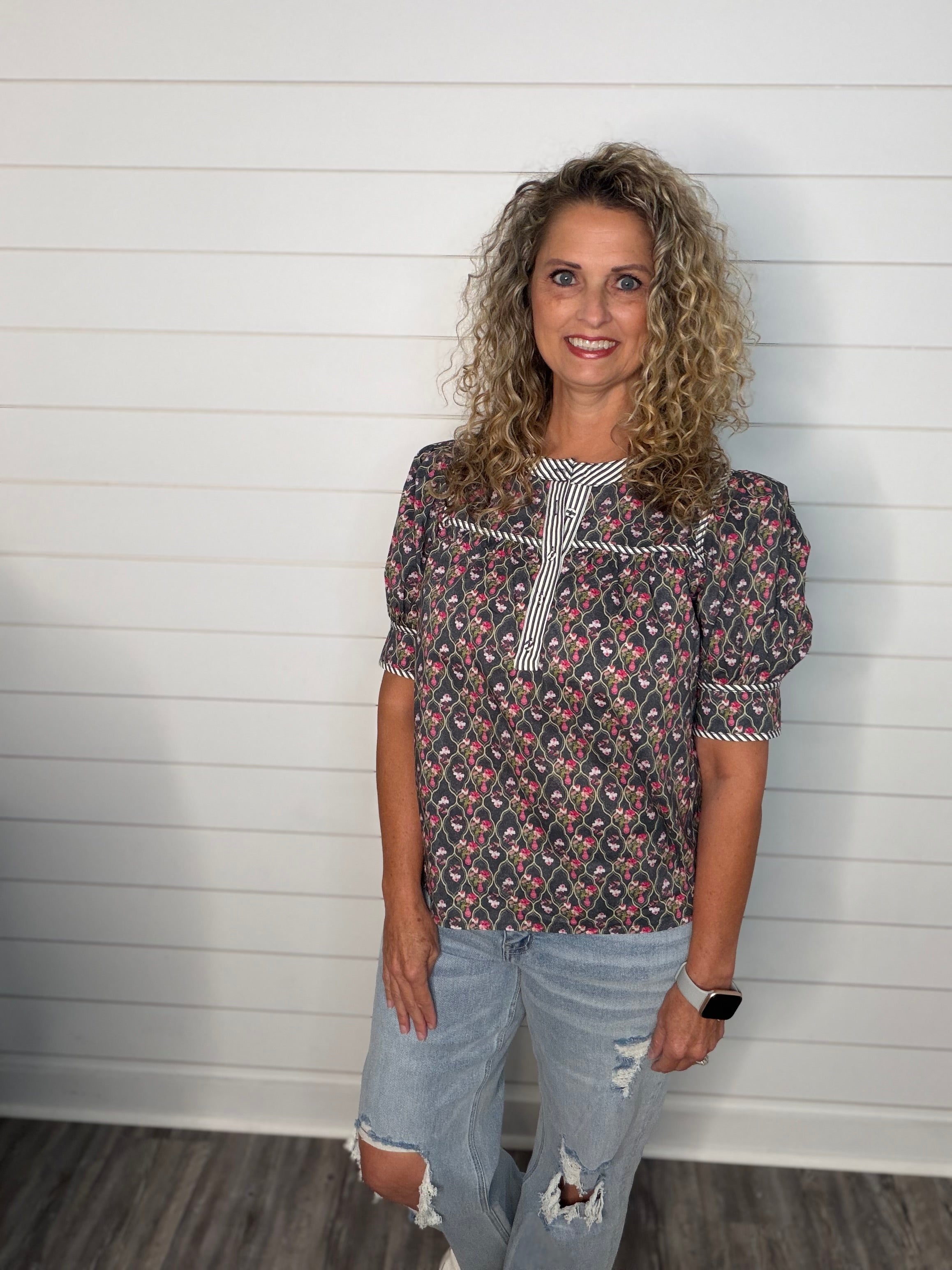 $49.99$0.00Available: In stockFloral print 3/4 puff sleeve top featuring half zip closure at front and contrast stripe ribbed stand collar and cuffs. Unlined. Woven. Non-sheer. Lightweight.