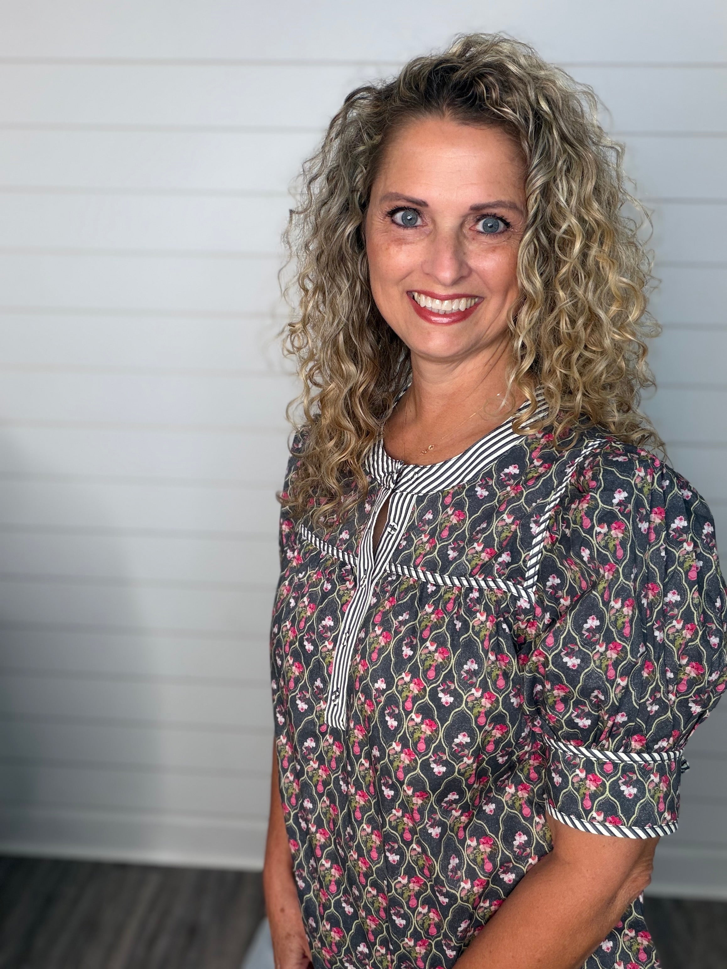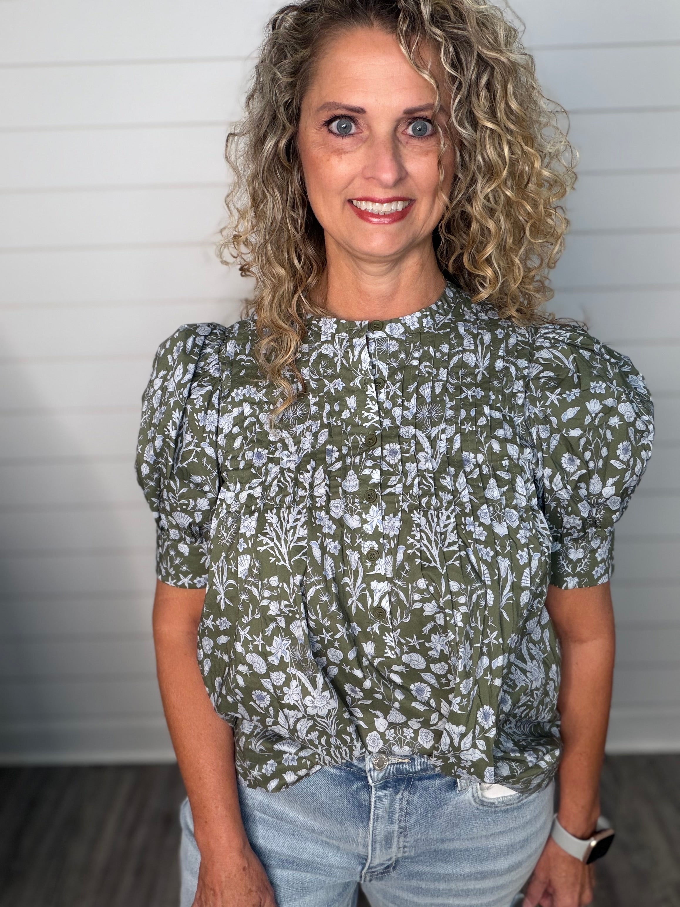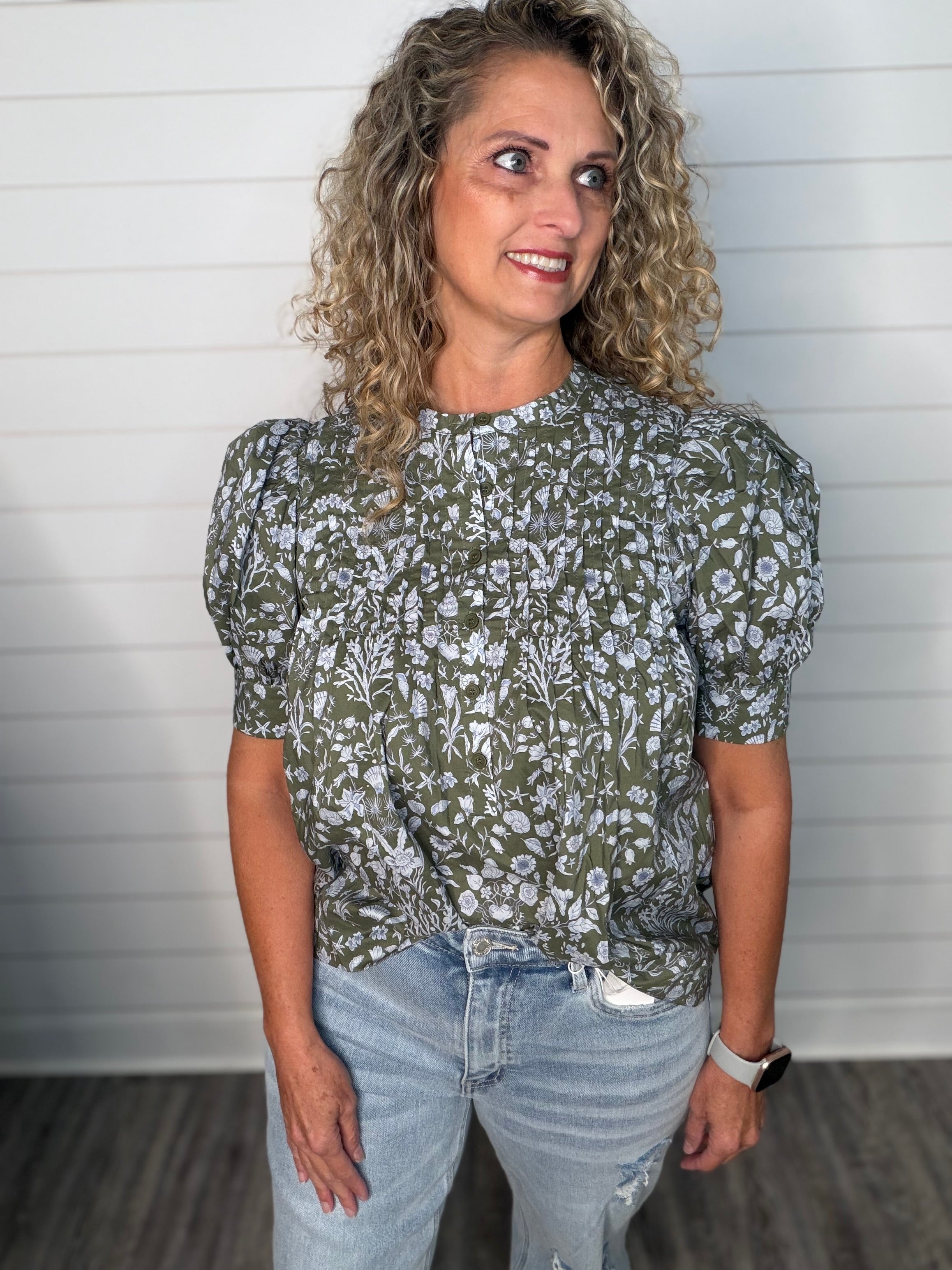 $49.99$0.00Available: In stockFloral print 3/4 puff sleeve top featuring half zip closure at front and contrast stripe ribbed stand collar and cuffs. Unlined. Woven. Non-sheer. Lightweight.