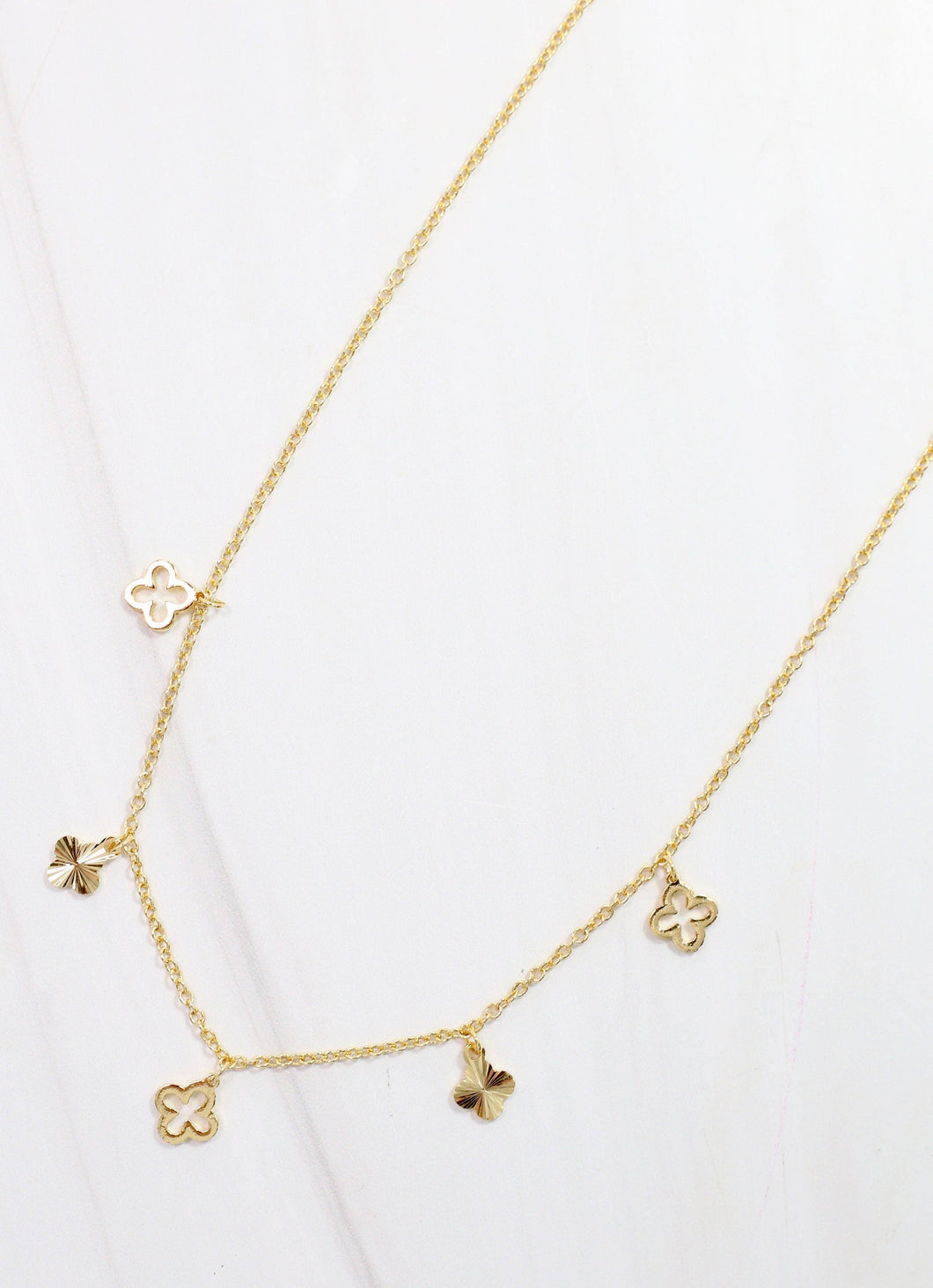 This link necklace features a mix of metal clover charms- some with a ribbed texture and others with an elegant open cutout design. It showcases the current trend of incorporating smaller charms perfectly.